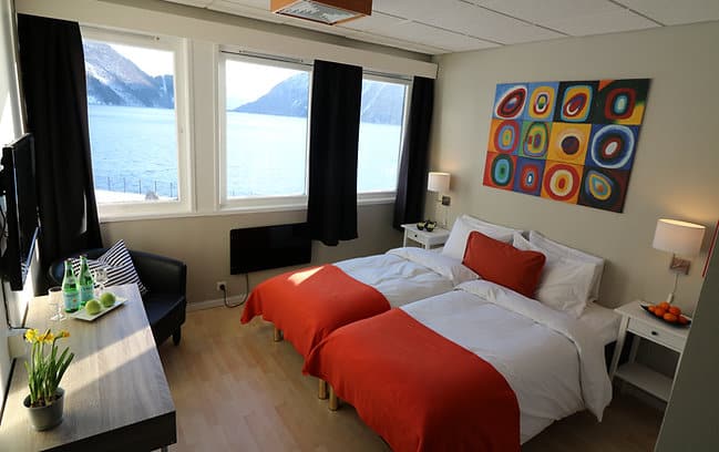 Choose between comfortable rooms with fjord views or views of Vadheim. Quality beds, free WiFi, and quiet surroundings provide a pleasant stay by the Sognefjord.